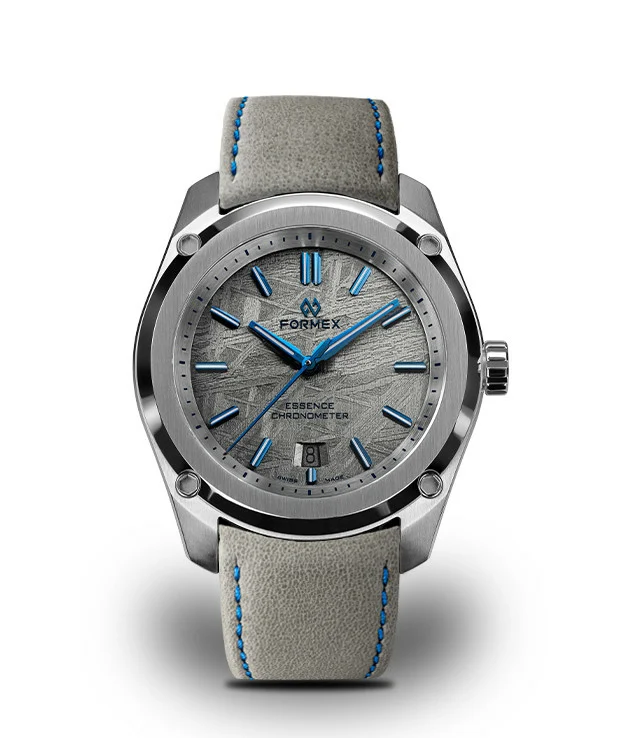 cadran de la Space Ghost cadran taillé dans la météorite Muonionalusta, un fragment vieux de plus de 4,5 milliards d’années qui a frappé la Terre il y a plus d’un million d’années. Son motif Widmanstätten caractéristique, formé par un refroidissement lent au cours des millénaires, confère cadran chaque cadran structure complexe et entrelacée qui le rend unique. Afin de préserver la beauté naturelle de la météorite et d’empêcher son oxydation, Formex, en collaboration avec Cadranor, sa société sœur spécialisée dans les cadrans et référence dans le secteur, a mis au point un traitement exclusif qui pénètre dans la matrice de fer poreuse. Un placage galvanique au rhodium scelle la surface et rehausse son éclat argenté sans altérer la texture brute sous-jacente. Les aiguilles et les index bleuis amplifient le caractère spectral cadran.