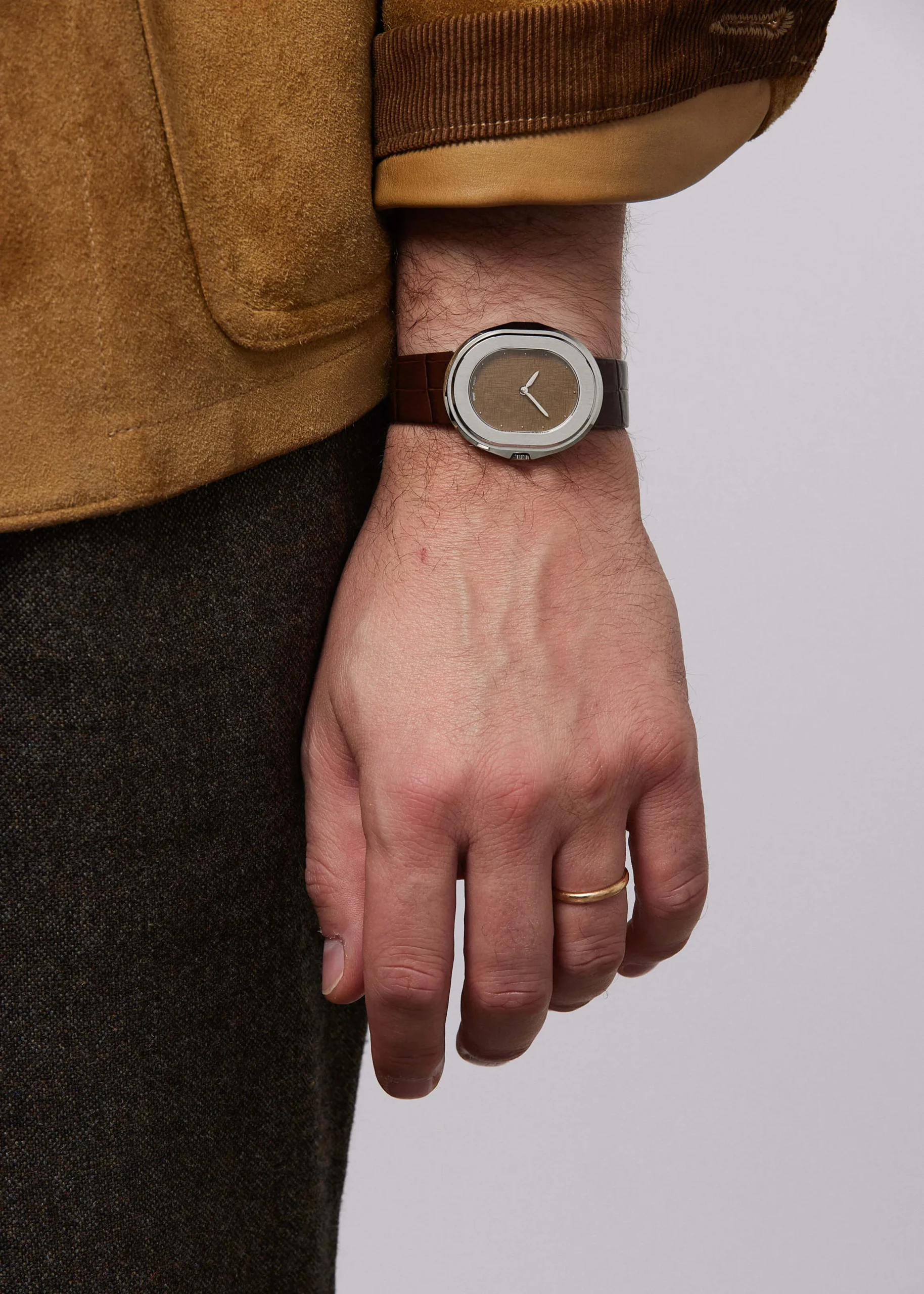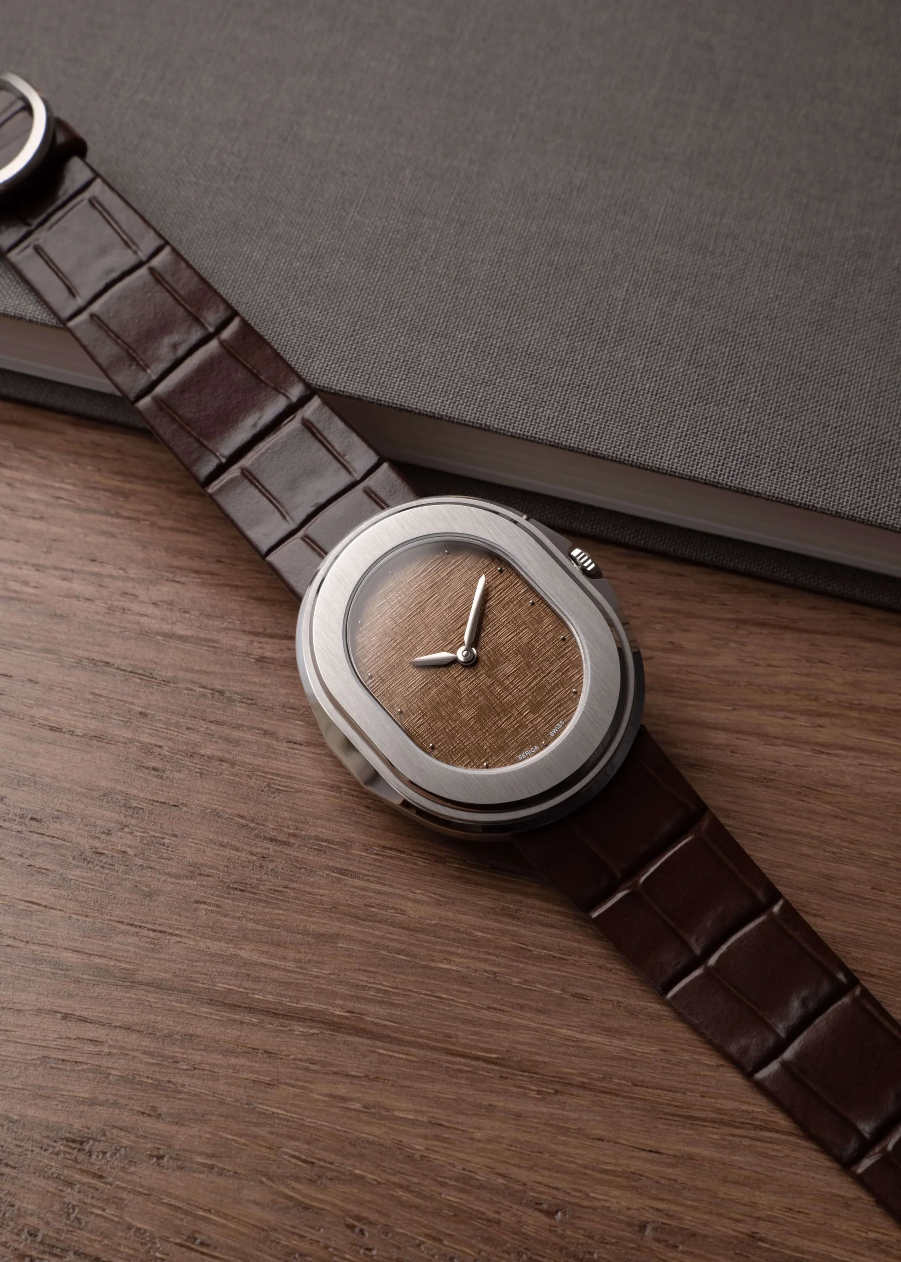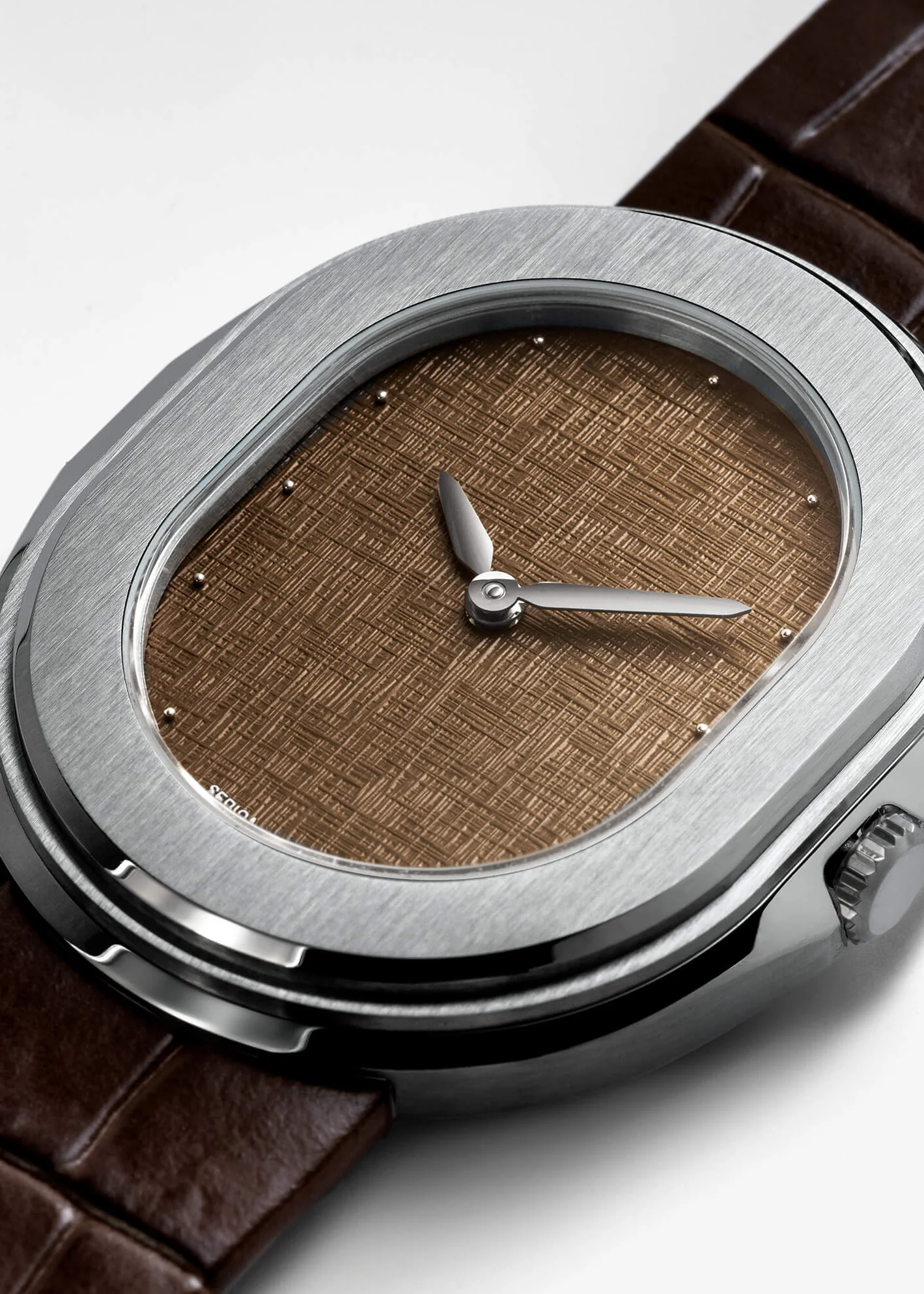 Le nouveau cadran ‘lin’ offre un relief profond reproduisant les fibres croisées du célèbre tissu. Un rendu plus proche de l’orfèvrerie que du traitement de surface auquel la teinte ‘Tabac’ confère des reflets nuancés allant du marron au vert et conserve toute l’élégance discrète, signature de la ‘Parade’.